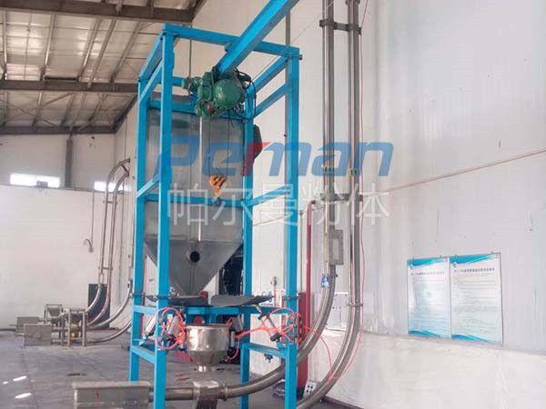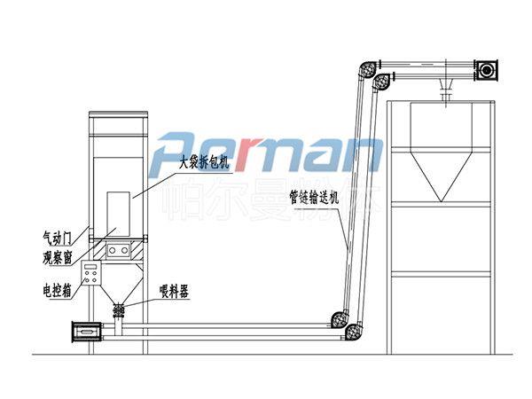 生產(chǎn)原材料會在皮帶輸送的作用進行進入到噸袋拆包機中進行拆包作業(yè),分離出的散料會在出料口直接進入到管鏈輸送機設(shè)備入料口中進行傳輸作業(yè)。