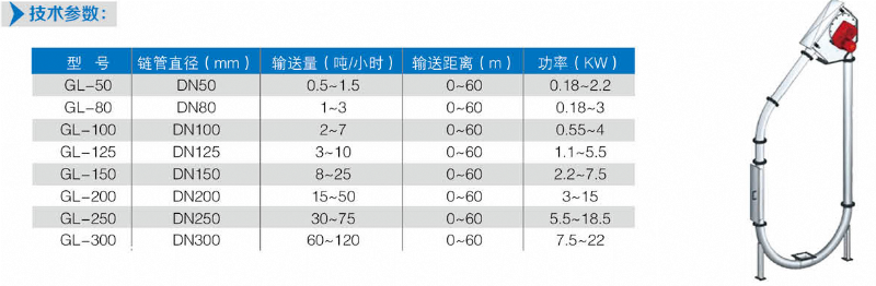 在密閉管道內(nèi),以鏈片為傳動構(gòu)件帶動物料沿管道運動。當水平輸送時,物料顆粒受到鏈片在運動方向的推力,就隨鏈片向前運動,形成穩(wěn)定的料流;當垂直輸送時,管內(nèi)物料顆粒受鏈片連續(xù)向上的推力,阻止了物料下滑,并產(chǎn)生了橫向側(cè)壓力,增強了物料的內(nèi)摩擦力,當物料間的內(nèi)摩擦力大于物料與管內(nèi)壁外摩擦力及物料自重時,物料就隨鏈片向上移動,形成連續(xù)料流。粉體物料可在三維空間內(nèi)沿封閉管道直線移動或改變方向;水平輸送距離可達60米,垂直輸送距離可達到30米。