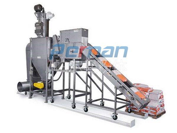 篩分裝置:篩分裝置中滾筒篩壁面布滿篩孔,篩板表面固定有可活動的6塊斜板,此斜板起到內(nèi)螺旋的作用。廢袋和物料進(jìn)入滾筒篩內(nèi),滾筒篩低速旋轉(zhuǎn),加速物料透過篩孔落入錐斗內(nèi),廢袋由滾筒篩內(nèi)螺旋輸送到滾筒出口,并掉落到廢袋輸送機(jī)內(nèi)。
